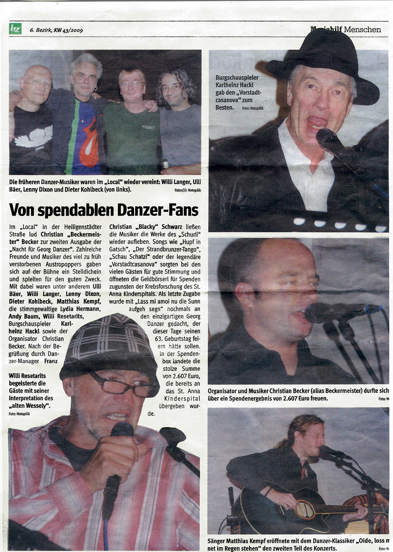 Im „Local“ in der Heiligenstadter Straße lud Christian „Beckermeister“ Becker zur zweiten Ausgabe der „Nacht für Georg Danzer“. Zahlreiche Freunde und Musiker des viel zu früh verstorbenen Austropoppers gaben sich auf der Bühne ein Stelldichein und spielten für den guten Zweck. Mit dabei waren unter anderem Ulli Bäer, Willi Langer, Lenny Dixon, Dieter Kohlbeck, Matthias Kempf, die stimmgewaltige Lydia Hermann, Andy Baum, Willi Resetarits, Burgschauspieler Karlheinz Hackl sowie der Organisator Christian Becker.